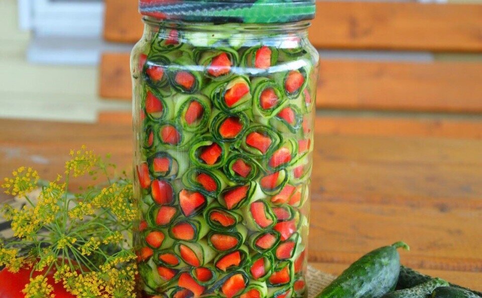 Вкусные закусочные рулетики из огурцов с красным болгарским перцем на зиму!