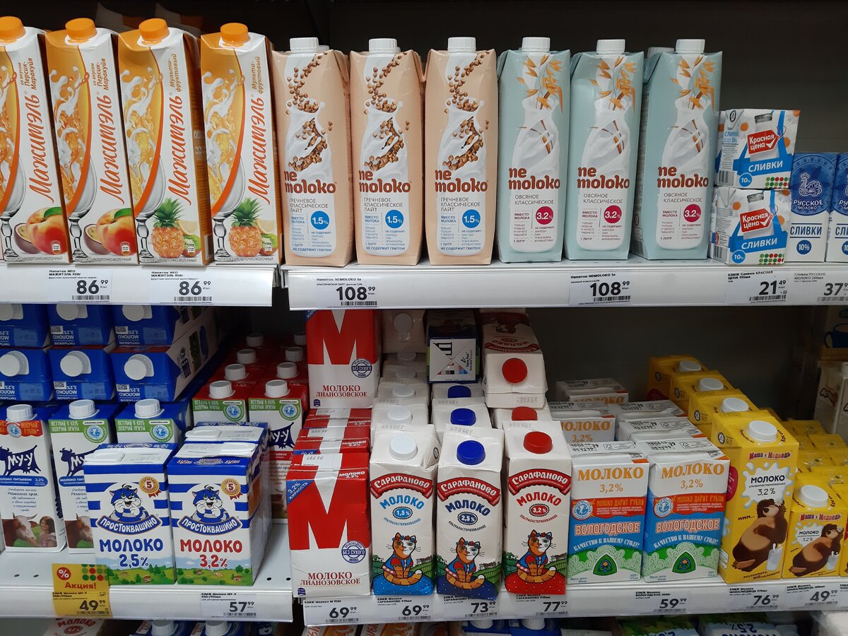 Вот «Пячтёрочка». По идее, даже этот продукт, который называется «Ne Moloko» и сделан из овса или из гречки, не должен стоять рядом с молоком.