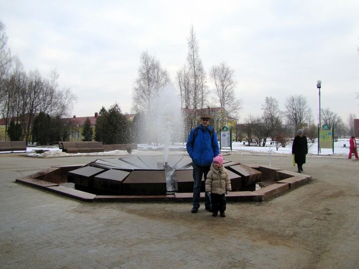 Мы начали знакомство с городом с курорта «Старая Русса». Удивила плата за вход – 50 рублей. До этого во все здравницы (точнее, парки при этих здравницах), мы попадали бесплатно. Но смотреть внутри особенно нечего. Парк как парк. Аллеи, деревья, детская площадка и мини-зоопарк с пони Пушкиным и бараном. И павильон с питьевой водой и огромным количеством сувениров. Кеша попробовал воду и сказал, что дико невкусная вода. И, как и положено в конце нормального февраля – очень мокро. Внутри парка —разрекламированная достопримечательность Старой Руссы, Муравьевский фонтан.Он бьет на высоту 10 метров и считается самым большим в Европе минеральным источником. Если верить, что высота струи – 10 метров, то какого роста те, кто стоит рядом, отгадайте?