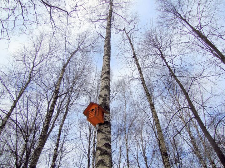 А вот ярко-оранжевые скворечники почти на каждой березе смотрятся очень красиво: