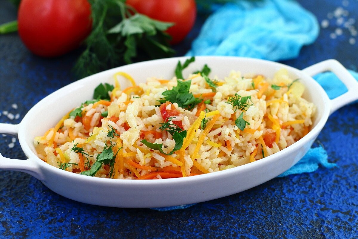 Яркое овощное ассорти с длиннозерным рисом – идеальное дополнение к основному блюду. Состав: рис – ½ стакана; помидор – 1 шт.; лук – 1 шт.; морковь – 1 шт.; зелень – для подачи; масло растительное – для жарки; соль, молотый перец – по вкусу. Приготовление 1. Рис промойте в нескольких водах. В кастрюлю с рисом наберите воды. Поставьте на плиту. Закипятите. Варите на небольшом огне в течение 15-20 минут. Рис должен полностью свариться. 2. Помидоры пробланшируйте. Снимите с них кожицу. 3. Нарежьте небольшими кубиками. Переложите в отдельную миску. 4. Морковь натрите. Луковицу нарежьте небольшими кубиками. 5. Отваренный рис промойте в дуршлаге. Дайте стечь жидкости. 6. В сковороду налейте растительное масло. Разогрейте. Жарьте лук и морковь на небольшом огне 10-15 минут. 7. Добавьте в зажарку томаты. Перемешайте. Накройте крышкой. Тушите 10 минут. 8. В сковороду добавьте отваренный рис. Посолите, поперчите, добавьте специи по вкусу. Перемешайте. Тушите под крышкой ещё 7-10 минут. Пере