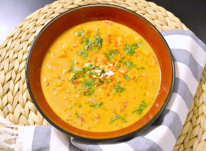 Ингредиенты: Приготовление: В антипригарной сковороде обжарить все порезанные на кубики овощи, добавив половину чайной ложки куркумы и карри, четыре или пять семян кориандра и тмина, свежий имбирь и лимонник. Между тем, смешать кокосовое молоко с 300 мл теплой воды и вылить все в сковороду, продолжая готовить и кипятить около десяти минут. Подавать с белым отварным рисом. Приятного аппетита! Читайте этот и другие вкусные рецепты на нашем сайте misspovar.ru