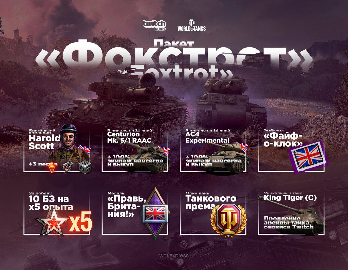 * Оба танка доступны в аренду, в течение 14 дней с получения набора «Фокстрот». Если захотите, чтобы они остались у вас навсегда, вы можете их купить, используя включённые в пакет скидки: 15% на Centurion Mk. 5/1 RAAC и 30% на AC 4 Experimental.