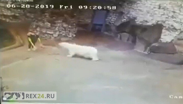 В сети появилось видео, на котором женщине удалось веником отбиться от белого медведя в зоопарке.