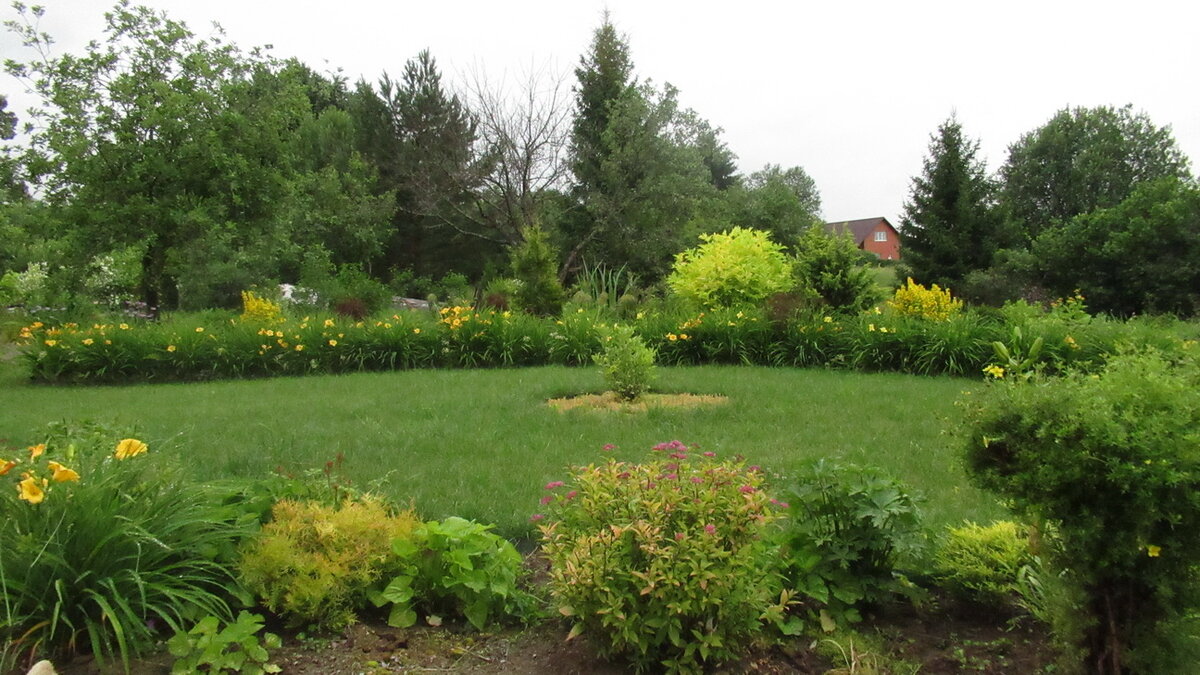 Каждые две-три недели в цветниках происходят изменения: одни растения отцветают и уходят на задний план, другие, наоборот, начинают цветение, радуя хозяина. А есть те, кто почти постоянны в течение всего сезона. Грамотное сочетание этих растений позволит садоводу наслаждаться прекрасными видами постоянно. Туи и можжевельники создают костяк этого микса, они лишь слегка меняются при отрастании молодых побегов. Лиственные кустарники могут цвести или расширять цветовую гамму за счет лаймовой, желтой, вариегатной, красной или темно-фиолетовой листвы. Здесь у меня и дерен Шпета с желто-зелеными листьями, и бузина аурея и бузина с темными листьями Black Beauty, и пузыреплодник Lady In Red. А как интересно смотрятся рядом растения с различной формой и размером листьев! Есть у меня в рассаднике парочка интереснейших кустов. Пока они подрастают, но я уже предвкушаю их посадку. Цветут лилейники: Happy Returns чуть повыше, с более холодными желтыми цветами и Stella de Oro пониже и с более