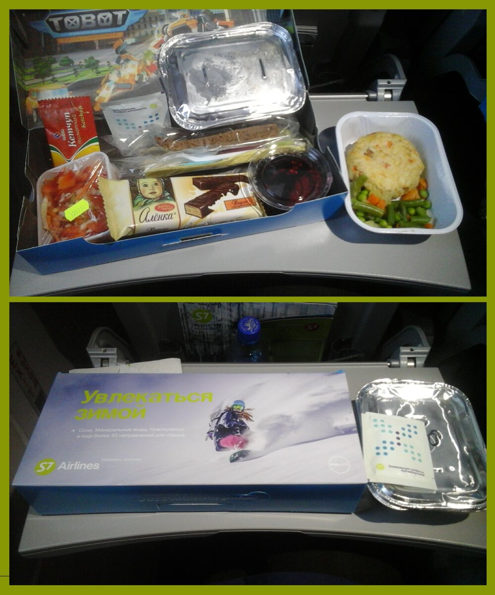 Дело было в феврале... Морозным зимним утром 13-го числа началось наше путешествие в солнечный Таиланд. Маршрут, признаться, был утомительным. Летели Благовещенск - Новосибирск - Бангкок (с 20-ти часовой стыковкой в Новосибе) и обратно тем же путём с остановкой на 2 суток... Где пережидали транзит - читайте тут. А пока что пару слов о питании на рейсах "S7 Airlines". На всех 4 рейсах горячее питание можно было выбрать разное. Например, на рейсе Благовещенск-Новосибирск нам предлагали на выбор "курица с гречкой" или "рис с овощами", на рейсе "Новосибирск-Бангкок" - "картофель с грибами" или "гречка с мясом" и т.д. То есть за всё время нашего путешествия можно было попробовать разные вариации горячего. Плюс к горячему фирменная коробочка с закусками - салат, хлеб/булочка, кетчуп, фрукты, сладости к чаю. На коротком рейсе (4,5 часа) из Благовещенска до Новосибирска нам сначала предложили напитки - сок (томатный, апельсиновый, яблочный) или воду с газом или без. Затем горячее питание.