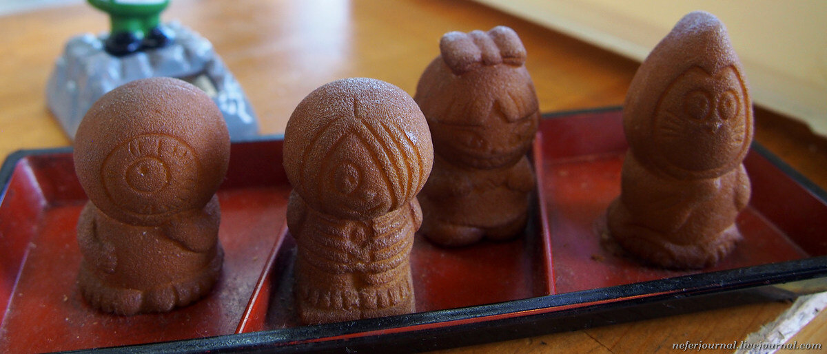 Одноглазый мальчик-ёкай, родившийся на кладбище. Умерший отец воплотился в его глаз. Ничего необычного, просто детский мультик. Кстати, Билайн вполне мог бы подсуетиться и сделать Китаро своим маскотом. Даже ничего переделывать не надо, обо всем позаботился Мидзуки Сигэру. В японском городе Сакаиминато, откуда родом Мидзуки Сигэру, почти все посвящено Китаро, это основная тема. Сладости с изображением героев, сувениры в виде глаза и даже вот такие кексики.