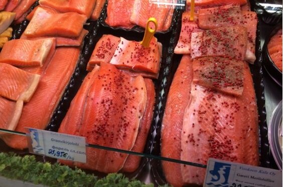 Однажды побывав с семьей в пограничном городе Финляндии - Лаппеенранта, мы зашли в рыбный магазин Disas. И там мы попробовали красную рыбу, которую солят прям при тебе. От полученного удовольствия вкуса, мы попробовали засолить рыбку таким же способом дома. И получилось очень аппетитно!!! Рецепт очень простой, но рыбка при этом получается очень нежной и вкусной! Что понадобится: 1. Красная рыба по Вашему желанию (мы берем форель, но можно взять лосось или семгу) - 500 гр. 2. Морская крупная соль - 3 ст. л. 3. Сахар - 2 ст. л. 4. Укроп - 100 гр. 5. Любая бумага для запекания 6. Перец горошком по вкусу (мы берем смесь перцев, где присутствует и черный, и красный перец) Способ приготовления: 1. Берем кусок красной рыбы, обрезаем плавники. Жир с рыбы я никогда не обрезаю, т.к. с ним она получается более насыщенной и вкусной. Моем рыбу и промакиваем ее бумажным полотенцем. 2. Смешиваем крупную морскую соль с сахаром и со смесью перцев. 3. Нарезаем укроп. 4. Выкладываем рыбу на бум