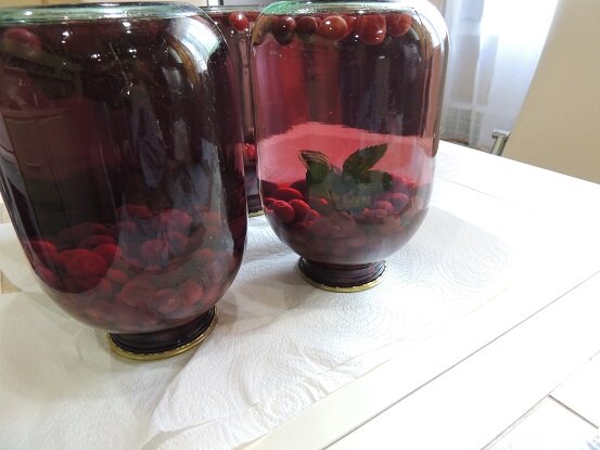 Всем привет. Вишневый компот с мятой на зиму - приятный, освежающий напиток, который порадует всех близких холодной зимой. Вишня для меня самая вкусная ягода. Как только она начинает созревать, я не упускаю шанс и максимально стараюсь её реализовать. Эта ягода не только вкусная, но и невероятно полезная. Вишня богата витамином А и С, она имеет удивительное свойство улучшать состояние кожи, поэтому эту ягоду часто используют в косметологии. Постоянные читатели уже знают, как много я закрываю компота на зиму. Моё семейство выпивает более 100 трёхлитровых банок. Порой и этого не хватает. Для приготовления одной 3х литровой банки понадобится: Этот компот можно закрывать, как с косточками, так и без них. Ягоду промывает, тщательно перебираем от веточек, просматриваем чтобы не было дефектов. Трёхлитровые банки промываем, рекомендую это делать с содой. Стерилизуем, для этого я использую чайник. Переворачиваю банку вверх дном на кипящий чайник, ошпариваю паром каждую банку не менее 10 минут.