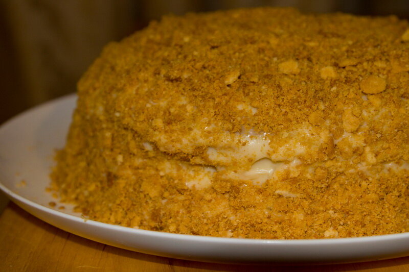 Самый передаваемый из поколения в поколение торт. Его можно заморозить! Один из самых нежно любимых, которые делали наши бабушки и когда мы стали бабушками, то тоже делаем для внуков. Вспомнила потом уже, что бабушка их вилкой тыкала перед духовкой или сковородкой, чтобы большими пузырями не шло. Укладываем коржи на тарелку и промазываем их кремом. На каждый корж по две столовые ложки крема. Верхний корж пока не смазывать. Обрезки от коржей тоже выпекаются, а потом просто растолочь в ступке или в блендере, как удобней. А вот теперь: Верхний не промазанный корж накрываем тарелкой и ставим небольшой груз. Лишний крем по бокам просто размазать ровно. Оставляем так на часик, Через часик слегка еще прижимаем сверху рукой, но не до фанатизма, никому ошметки на потолке ненадо. теперь выкладываем оставшийся крем на верхний корж и посыпаем крошкой. Отправляем нашего Наполеона в ссылку но не на остров, а в холодильник на ночь. Ну хотябы на 10-12 часов. Нарезать, и есть, и млеть от радост