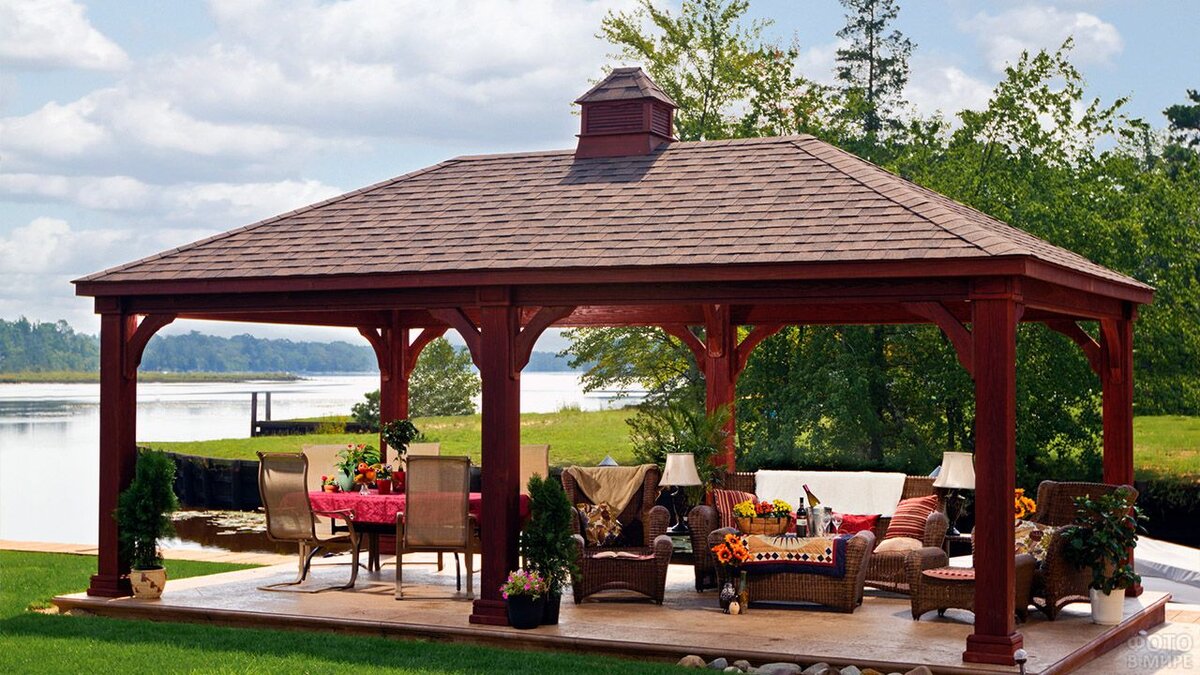 Восточный стиль. Подобные беседки сразу настраивают на отдых, покой, расслабление, неспешное общение.
