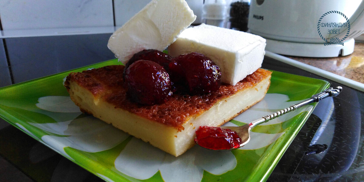 Только приехав в Финляндию, я разузнала, как же готовится этот простой, но вкусный пирог. Его название тоже простое: Pannu — это сковородка, а Kakku — как раз пирог. Видимо, раньше его ставили в печь на большой сковороде, ну а сейчас, конечно, все пользуются противнями. И сковородка тут возникла не случайно. Если вы прочтете рецепт, то поймете, что тесто практически блинное. Просто его жарят в духовке всё разом, а не разделив на маленькие порции. Нас учат, что чем тоньше блин, тем вкуснее. Это так. Но самое смешное, что этот самый толстый блин в мире — тоже объедение!