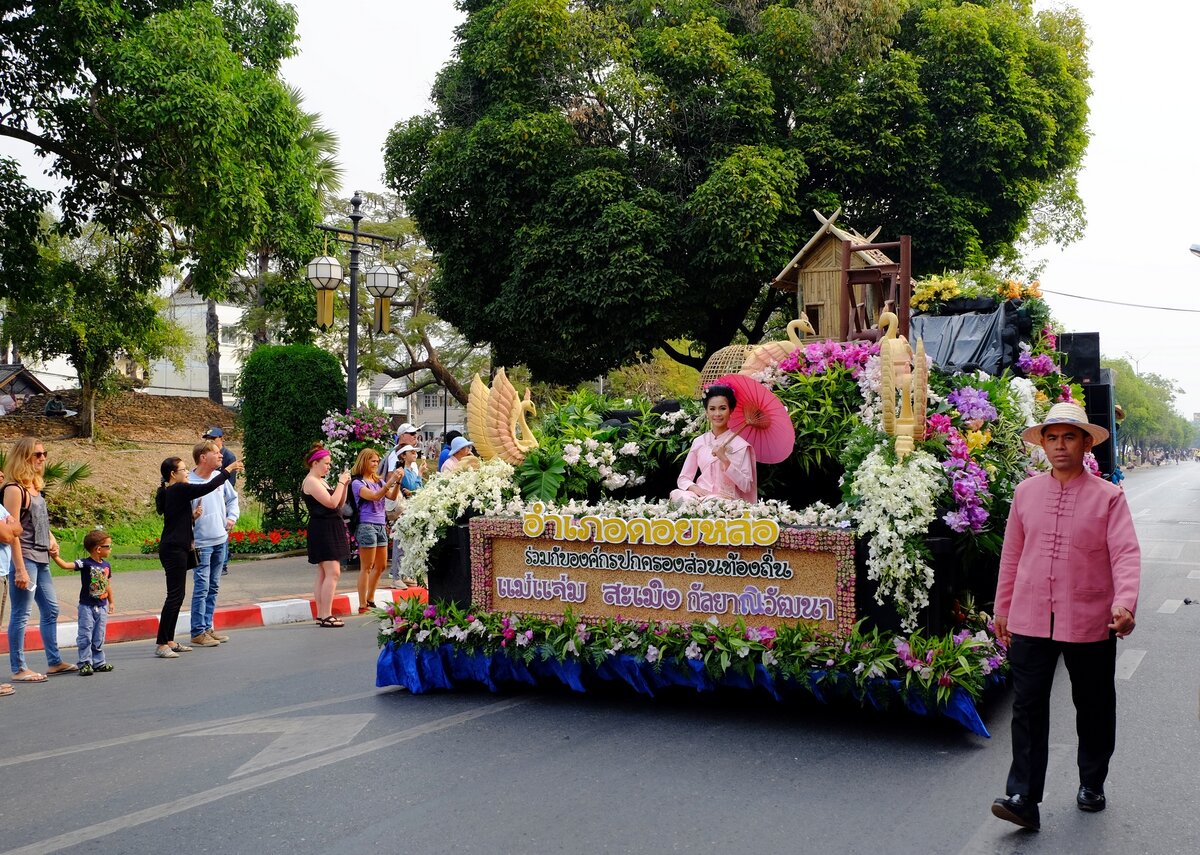 Про пхукетский фестиваль и парад образца 2019 года я рассказала (ссылка) и лучшие фото показала, теперь вернусь в 2018 год в город Чианг Май, где в первые выходные февраля проходит праздник цветов. Этот трёхдневный фестиваль включает в себя разные мероприятия: выставки, концерты, конкурс красоты, а самое зрелищное - это парад с проплывающими по улицам старого города платформами из живых цветов: Потом эти махины установят у парка, где они послужат фоном для многочисленных фото: Также восхищают колонны нарядных участников: Зрители стоят и сидят вдоль улиц или, как мы, на набережной, наслаждаясь зрелищем: Самые активные зрители фотографируются с "демонстрантами", и 10 лет назад мы тоже не стеснялись: Помню, тот парад нас зачаровал и потряс, а в 2018 г. всё показалось скромнее, хотя цветочные платформы были всё так же изумительны: Посмотреть фото участников этого парада можно по этой ССЫЛКЕ. Такое незабываемое зрелище никого не оставляет равнодушным!