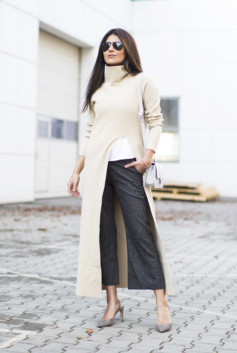 Туника длины макси с высоким горлом и внушительным разрезом отлично впишется в повседневный гардероб. С ней можно составить простой, но очень интересный образ. Наденьте под бежевую тунику хлопковую майку или футболку. В качестве низа подойдут деловые брюки, слегка расклешенные к низу. Небольшая сумка и замшевые туфли с открытой пяткой станут гармоничным завершением ансамбля.