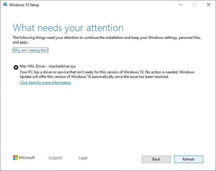 Обновление Windows 10 мая 2019 года (версия 1903) доступно уже более месяца. Обновление функций для Windows 10 приносит много новых функций в операционную систему, включая Windows Sandbox. MMac HAL Driver - ошибка machaldriver.sys Многие пользователи Mac, работающие под управлением Windows 10 с использованием программного обеспечения Apple Boot Camp Assistant , получают сообщение об ошибке « Mac HAL Driver - machaldriver.sys: на вашем компьютере есть драйвер или служба, которая не готова для этой версии Windows 10 » при попытке установить или обновить до Обновление за май 2019 года (версия 1903). Если вы также получили сообщение об ошибке «Mac HAL Driver - machaldriver.sys: на вашем компьютере есть драйвер или служба, которая не готова для этой версии Windows 10», это связано с тем, что ваш Mac изготовлен до 2012 года или работает под управлением более старой версии. Boot Camp Assistant или программное обеспечение поддержки Windows. Да, на данный момент Windows 10 мая 2019 года не по