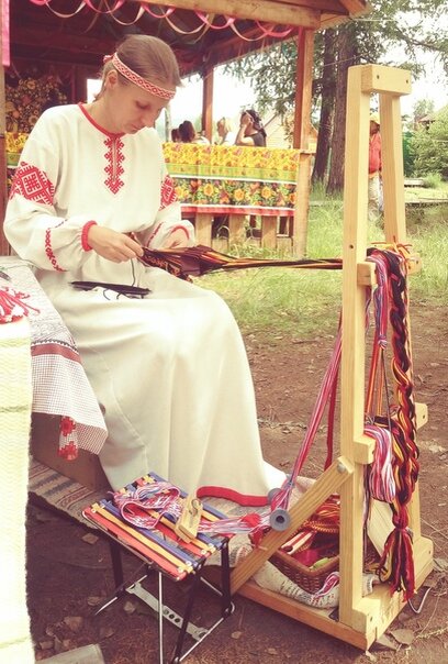 Древнейшему способу ткачества на дощечках могли научиться участники и гости IV межрегионального фестиваля русской культуры «ВерховьЁ». Мастерица из села Разъезжее Ермаковского района Красноярского края Надежда Фисенко показала, как своими руками сделать красивый пояс или очелье. Это сейчас одежда имеет только две функции – практическую (для защиты от холода, ветра, жары) и декоративную. Древние культуры, в том числе славянская, придавала одежде обережное значение. Защищать от нечисти и дурного влияния призван был каждый элемент повседневного и праздничного платья славянских народов. Два из них – обережные пояса и очелья (повязки на голову – прим. TMG) – собственного производства на фестиваль «ВерховьЁ» привезла Надежда Фисенко. Надежда ведёт занятия в ремесленной мастерской при доме культуры в Ермаковском.Занимается народными промыслами уже пятнадцать лет. За это время обучила мастерству нескольких учениц. Кроме ткачества можно научиться вязанию, лепке из солёного теста и изготовлению