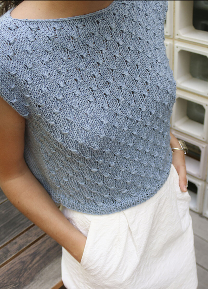 Этот эффектный топ связан по принципу наволочки - никакой выкройки, пройм и сложных расчетов. Просто два прямоугольника, сшитые между собой по плечевым и боковым швам. Изюминкой полотна является симпатичный узор, который вяжется проще, чем выглядит. Узелки на полотне это простое обвитие связанных петель нитью. Разбор узора Число петель должно быть кратно трем. Первые три ряда после резинки вяжем лицевую гладь. В четвертом приступаем к обрисовыванию узелков. Провязали 6 петель, переносим три петли на дополнительную спицу и обвиваем их рабочей нитью дважды - перекидываем нить на изнанку, проводим на лицо и еще раз на изнанку и на лицо. Возвращаем петли на основную спицу - получили узелок. Затем провязываем 6 лицевых и из трех последних снова делаем узелок-обвитие. Так продолжаем до конца ряда. Затем вяжем 6 рядов лицевой глади (при поворотном вязании лицевые и изнаночные соответственно). В седьмом снова делаем узелки, но размещаем их в шахматном порядке над предыдущими. Спицы и ни
