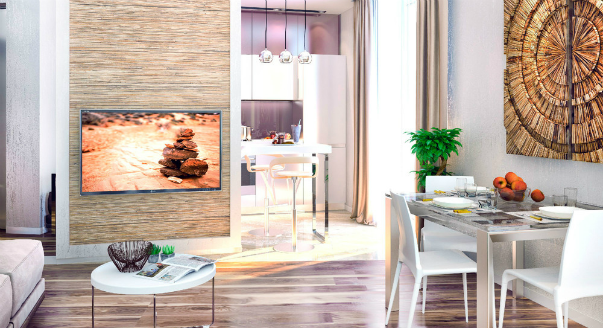 Проектируя интерьер крошечной угловой студии, дизайнеры салона «Декорум» не ударились в минимализм, а нашли массу эффектных и впечатляющих приемов. Одна кровать на цепях чего стоит! Небольшая угловая квартира изначально не могла похвастать удобной планировкой: вытянутое в длину узкое помещение требовало особенно креативных решений. Дизайнеры из интерьер-салона «Декорум» нашли выход: в торцевой части квартиры разместилась спальня, отделенная от остального пространства мобильной перегородкой. Открытая планировка позволила спроектировать многофункциональный интерьер на скромной площади, а красивый балкон обеспечил отдельную лаунж-зону. План вытянутой квартиры-студии, расположенной в торце многоэтажного дома. Прихожая неправильной формы сразу задает вектор движения. Ключевой декор интерьера – деревянное панно – замыкает перспективу. За зеркальными дверями, увеличивающими объем небольшого помещения, прячется санузел. Гардероб находится с другой стороны, за глухой белой гармошкой. Гост