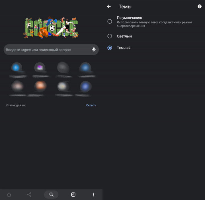 После этого в настройках браузера появится раздел «Темы», в котором на выбор будут даны три позиции: «Светлый», «Тёмный» и «По умолчанию» (при включении тёмная тема будет применяться при включении режима экономии энергии).