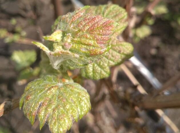 На листьях винограда появились красноватые пятна. Что это и как с этим бороться? Подобные вопросы поступают и от многих любителей винограда. Судя по фотографиям, листья повреждены виноградным войлочковым клещом, или виноградным зуднем. Подобное поражение носит название войлочность винограда, или эриноз. Этот вредитель распространен повсеместно, где выращивают виноград. Весной при температуре около 15° клещи выходят из мест зимовки и заселяют первые листья виноградного растения. На листьях образуются вздутия-галлы зеленоватого или красноватого цвета, а на нижней стороне сначала беловатый, а позднее желто-бурый войлочный налет. Листья становятся уродливыми, бугристыми. После высыхания галлов клещи продолжают миграцию на молодые верхушечные листья. В течение лета развивается несколько поколений вредителя, клещ расселяется с зараженных кустов на здоровые. К осени самки уходят на зимовку, прячутся в трещинах коры и под чешуйками плодовых почек. При сильном поражении клещ может нанести знач