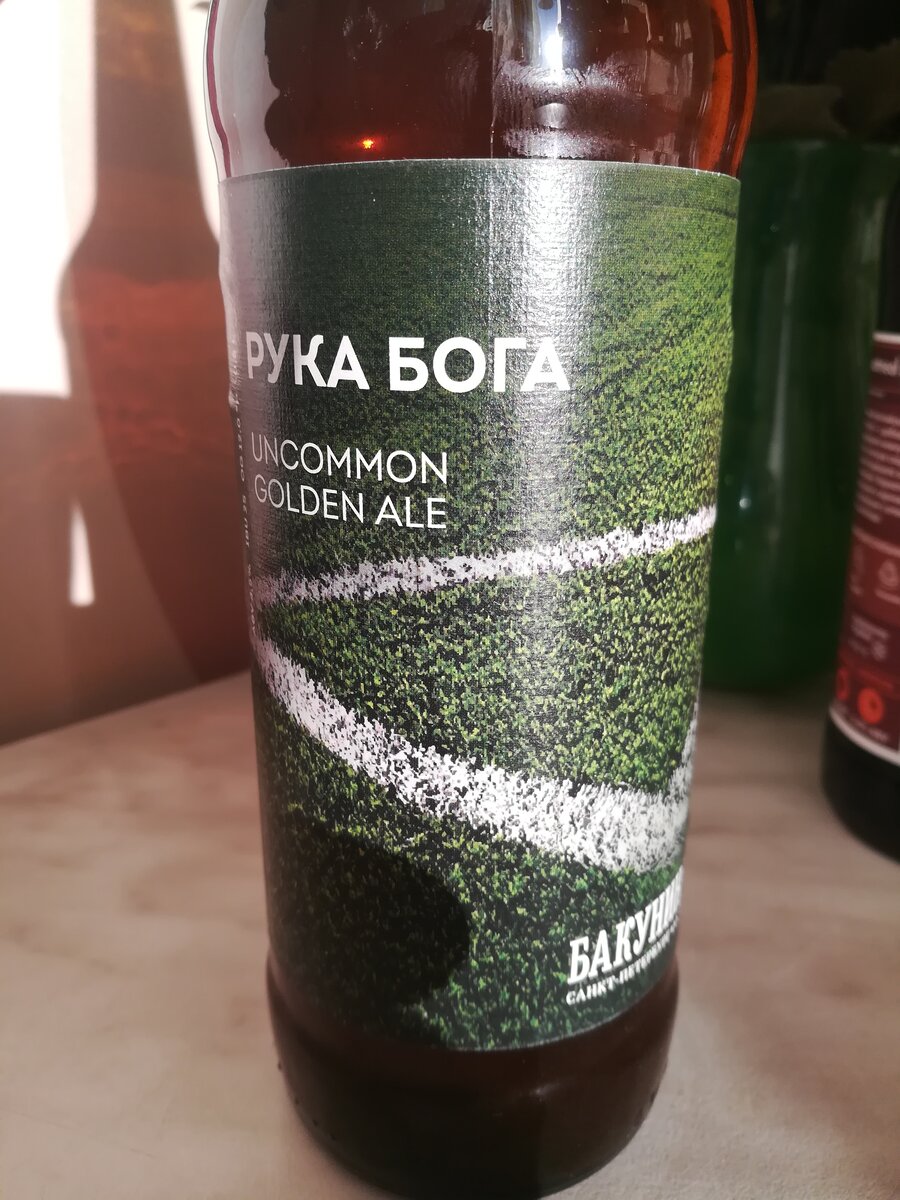 Всем привет! Буквально на днях снова решил себя побаловать после работы бутылочкой хорошего, вкусного пива. Ассортимент магазина разливного пива, который находится неподалеку, я уже досконально изучил. По пути с работы до магазина ломал голову, что бы такого купить, чего еще не пробовал, но придя в магазин, вопрос отпал сам собой. В магазине была поставка бутылочного и баночного пива, среди которого я увидел Uncommon Golden Ale "Рука Бога" от пивоварни Бакунин. Данное пиво было названо в честь знаменитого гола в ворота англичан на ЧМ по футболу в 1986, который забил, ударом рукой по мячу, звезда футбола - Диего Марадона, а варка этого пива была приурочена к ЧМ по футболу-2014. Бутылка пива мне обошлась в 170 рублей. Состав: вода, солод ячменный, хмель, дрожжи. Описание: Производитель: ООО "Пивоварня Мюнхель", г. Санкт-Петербург Стиль: Uncommon Golden Ale Дегустация: Пиво красивого медного цвета. Пена среднезернистая, опадает достаточно быстро, но держится тонким