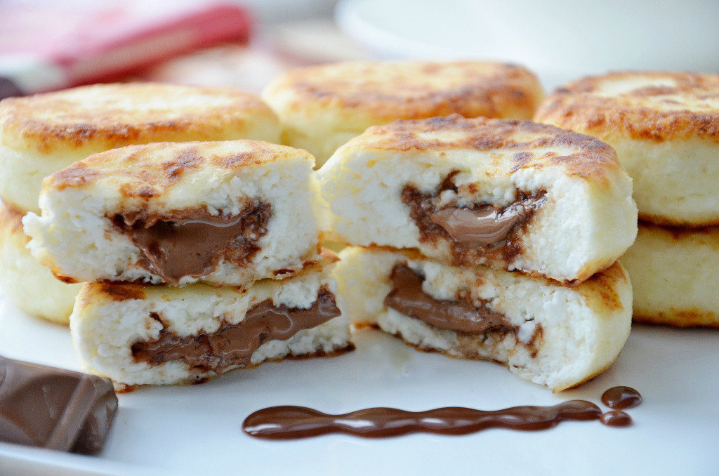 1.В средней миске смешайте муку с разрыхлителем и солью. 2.Творог смешайте с яйцами, сахаром и ванилью и взбейте в комбайне до однородной массы. 3.Добавьте сухую смесь и перемешайте. Масса будет слегка липучей. 4.Нагрейте 2 столовых ложки сливочного или растительного масла на сковороде. В тарелку выложите полстакана муки. 5.Ложкой отмерьте порцию теста, на середину выложите квадратик шоколада. В таком состоянии тесто положите в тесто, сверху присыпьте также мукой. 6.Слепите сырник. 7.Повторите с остальным тестом и шоколадом. 8.Обжарьте с обеих сторон до золотисто-коричневой корочки на низко-среднем огне. 9.Присыпьте сырники сахарной пудрой и подавайте с фруктами, джемом или сметаной