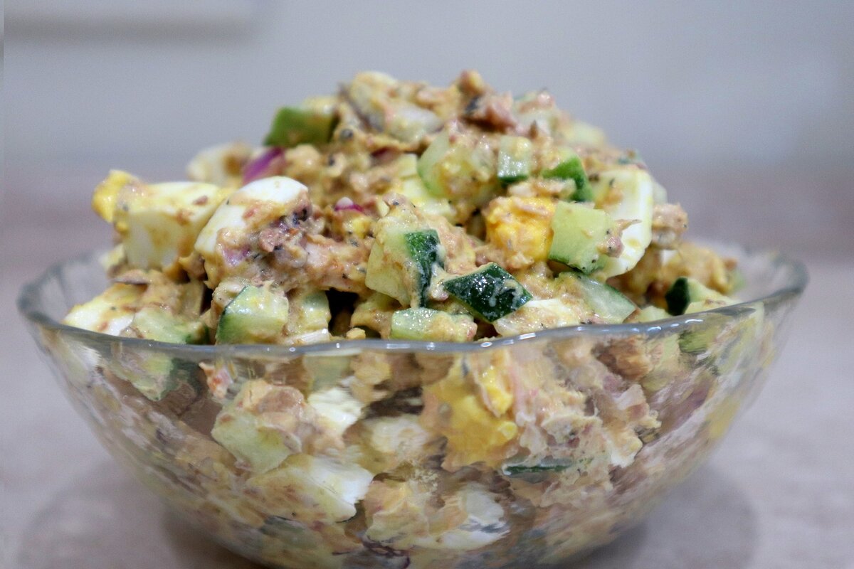 Улетный салат с консервированной сайрой, яйцом и огурцом/сытный салат из рыбной консервы