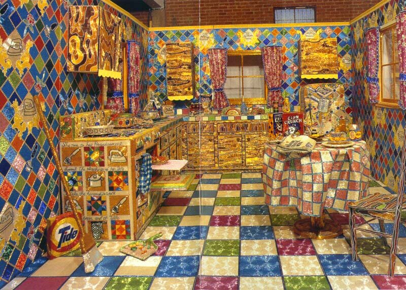 Ее “Кухня” (15,6 кв. м.) – это что-то сказочное: очень яркая, украшенная множеством узоров и текстур. Здесь все сделано из бисера: и пол, и стены, и мебель, и вся утварь. Сложно представить, что все это создано человеческим руками. Работа над инсталляцией заняла пять лет: с 1991 по 1996 год.