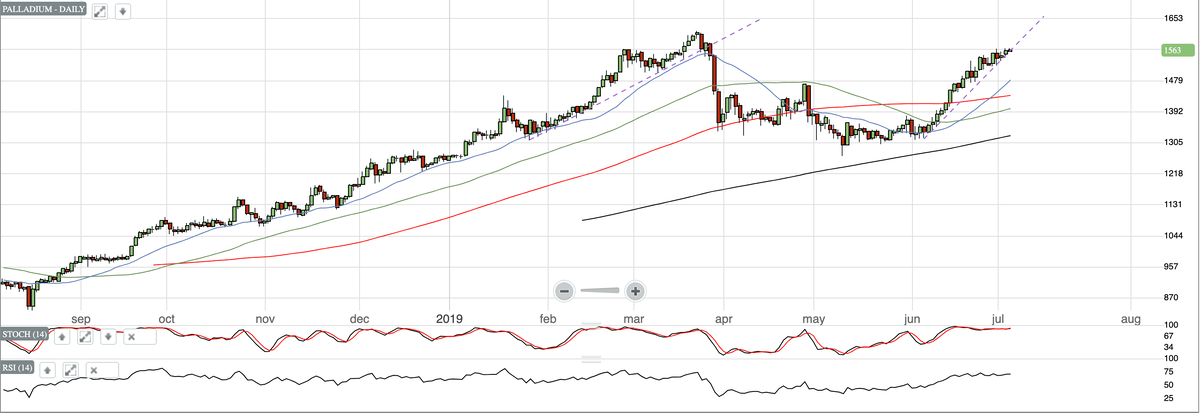 Очень короткий срок (1М): Краткосрочный (3М): Среднесрочный (6М): Долгосрочный (12М): Сопротивляемость: R1 1600 психологических R2 1617,50 рекордно высокого уровня R3 Служба поддержки: S1 1 466,5 апреля S2 1,267 мая 2019 года минимум S3 1 259 января 2019 года низкий Стохастик: бычий Условные обозначения: BB - полоса Боллинджера D / WMA - дневная / недельная скользящая средняя D / UTL - линия нисходящего / восходящего тренда ETF - биржевые фонды H & S - модель головы и плеч HSL - горизонтальная линия поддержки MACD - дивергенция схождения скользящей средней RSI - индекс относительной силы SL - линия поддержки Анализ Драйверы макросов В отличие от остальных драгоценных металлов, в ETFs из палладия продолжается отчуждение. Ликвидация 6 849 унций снизила запасы до 642 650 унций на 1 июля. Поскольку спотовая цена на палладий близка к рекордно высокой, привлекательность фиксации прибыли достаточно высока, что приводит к выпуску акций на очень узкий рынок. Плотный фундаментальный фон ос