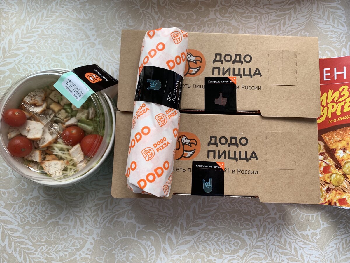 В Додо я бываю редко, а заказываю оттуда - еще реже. Дело не в том, что эта сеть мне не нравится, а в том, что подобная еда очень быстро надоедает. Но сегодня я не успела приготовить себе обед, а времени идти на ланч не было, поэтому я решила заказать еду (заодно и на ужин) из Додо. Заказ обошелся мне в 660 рублей с учетом скидки баллами. На обед я взяла Додстер - что-то вроде маленькой шавермы с куриным филе, помидорами, салатом и соусом. Штука достаточно сытная и горячая, упакована в фольгу и бумагу. На гарнир я взяла картошку из печи, она очень-очень вкусная. И порция для такой цены - здоровенная. Соусы я не беру, у меня их хватает дома. На десерт я заказала 16 рулетиков с брусникой (к сожалению, порций меньше в доставке нет). Если вы их ещё не пробовали - очень советую. И, наконец, на ужин я заказала салат «Цезарь». Он немного суховат, но в целом хорош, порция большая и сытная. Соус - в комплекте. Своим сегодняшним заказом я довольна, и привезли его очень быстро, буквально за полча