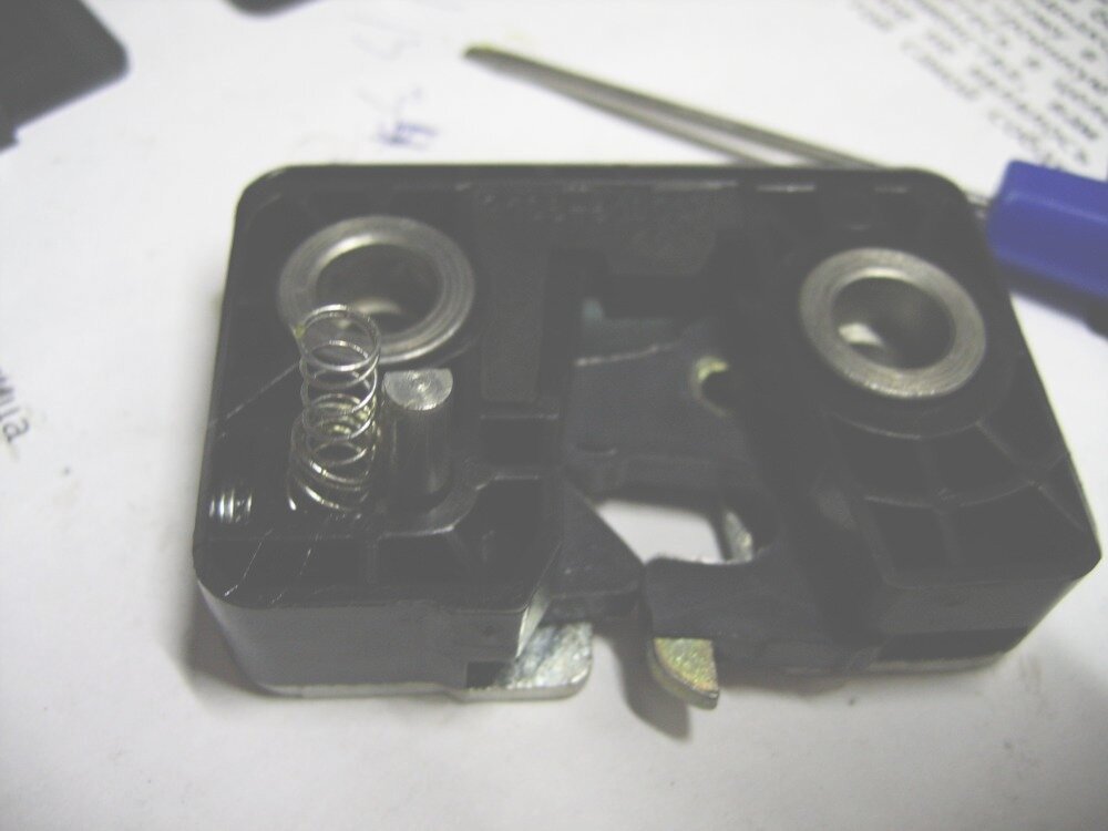 Первым делом нужно снять замок с двери. Он крепится на двух болтах. Повернув его вы увидите под рычажком открывания двери две пружинки. Одна внутри другой. Так вот надо вынуть внутреннюю пружинку и оставить в дверном замке только наружную. Мы сделали чтобы замок открывался и закрывался в два раза легче.