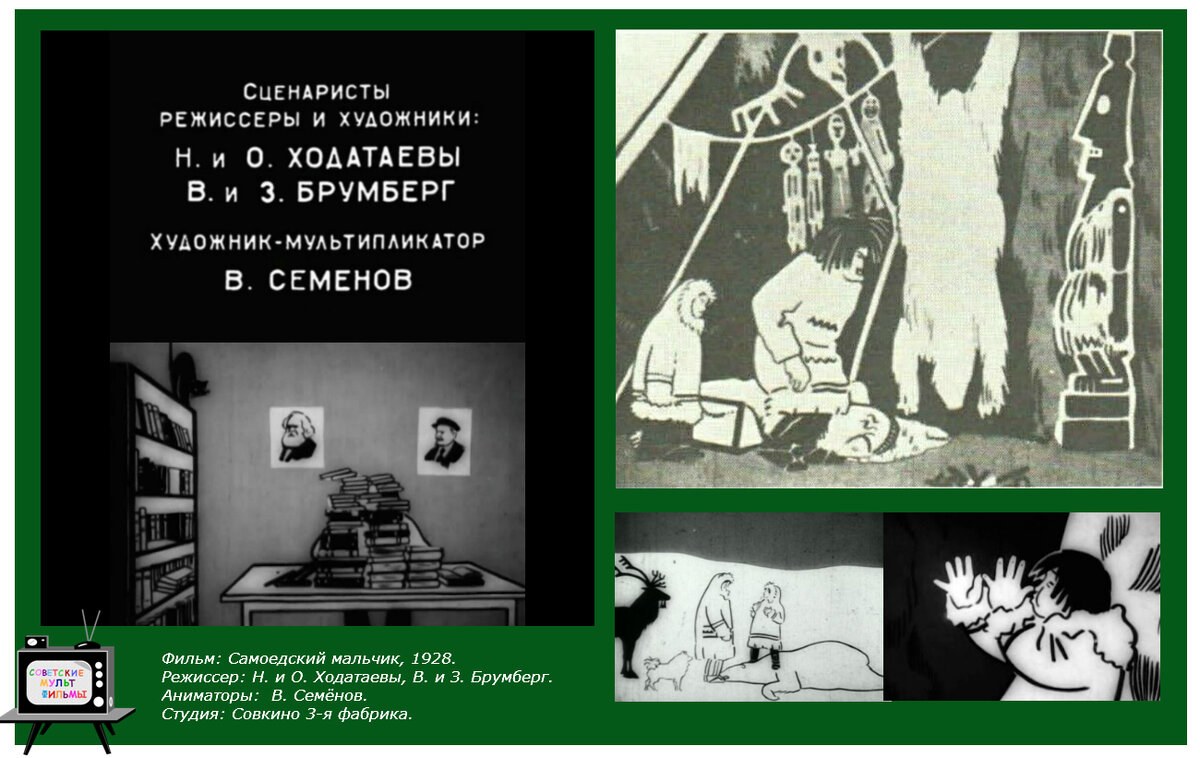 Картина «Самоедский мальчик» была создана двумя семейными дуэтами – братом и сестрой Ходатаевыми и сестрами Брумберг. Картина имела политическое звучание, т.к. показывала путь «идеального» советского гражданина. Сюжет незамысловат: Смелый мальчик из племени самоедов по имени Чу разоблачает обман шамана: Здесь стоит громадный чум – В нем живет шаман-колдун. Чу сестру и мать кормил, У шамана он служил. Чтобы идол был живой, Чу качал его ногой. И, вводя народ в обман, Чудеса творил шаман. (Строки субтитров к фильму) Шаман хочет поквитаться с мальчишкой, и тому приходится покинуть свое племя. Волей судьбы, Чу попадает в Ленинград, поступает на Рабфак Северных народов, чтобы потом с новыми знаниями вернуться в родные места и менять жизнь к лучшему. По художественным достоинствам эта картина была одной из самых значительных и этапных в советской мультипликации 1920-х годов. Если все предыдущие мультипликационные фильмы были сделаны белой линией на черном фоне или черной линией на белом фон