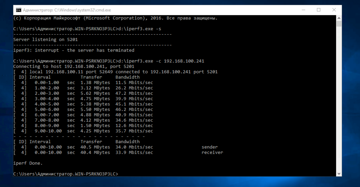 В сети много описаний более старые версии, в которых по умолчанию тестируется только входящий или исходящий трафик. Я же рекомендую использовать современную версию iPerf 3.1.3, где сразу выдаётся нужный результат без дополнительных ключей.