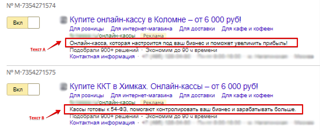 В течение определенного отрезка времени потенциальным клиентам показывают несколько версий контекстной рекламы. Затем сравнивают статистические показатели внимания и действий аудитории, после чего делают выводы о том, какие элементы рекламных объявлений привлекают клиентов, а какие — нет.