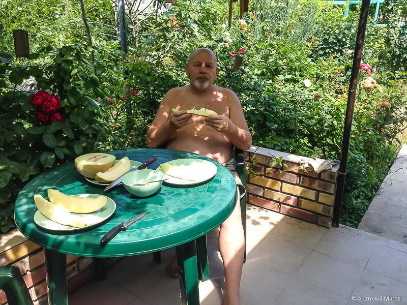 Принес сегодня с рынка дыню. Уже крымская, не привозная. Очень рано дыни в этом году созрели. Лето жаркое, каждый день +30. И практически без дождей. Где-то в Симферополе и на ЮБК случаются грозы, но нас они проходят стороной. А дыни такую погоду любят. Я еще в воскресенье видел, что на рынке появились дыни. Но цена была 80 руб/кг, дорого. А сегодня цены упали - уже 30 руб. Я покрутил дыню в руках, понюхал - пахнет хорошо, дыней пахнет, как и должно быть. А как ее еще проверишь? Это же не арбуз, который можно помять и пощелкать. Дыня не хрустит и не издает звуков в зависимости от спелости. Ее только по цвету и по запаху можно выбрать. И то не всегда получится. Бывает, что дыня спелая и сочная, а на вкус как трава. Продавщица, видя мои сомнения, говорит, что у нее сегодня дыню покупал мясник из ларька напротив. Я повернулся, помахал ему рукой и спрашиваю, как дыня? Он отвечает, что хорошая. И я взял одну. Потянула на 2,5 кг. И, конечно, сразу мы с женой эту дыню разрезали и оценили.