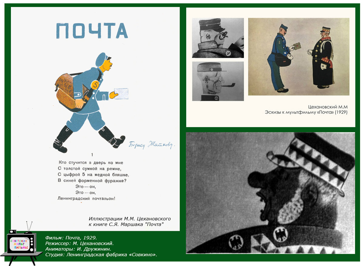 Взлет Ленинградской мультипликации связан с приходом в нее Михаила Цехановского, мастера книжной иллюстрации. Лучшей его работой в области книжной графики по праву считается «Почта» С.Я. Маршака (1927). В 1929 году Цехановский «оживил» свои иллюстрации. В 1930 году он создал звуковой вариант фильма, с музыкой композитора Владимира Дешевова и конферансом Даниила Хармса.