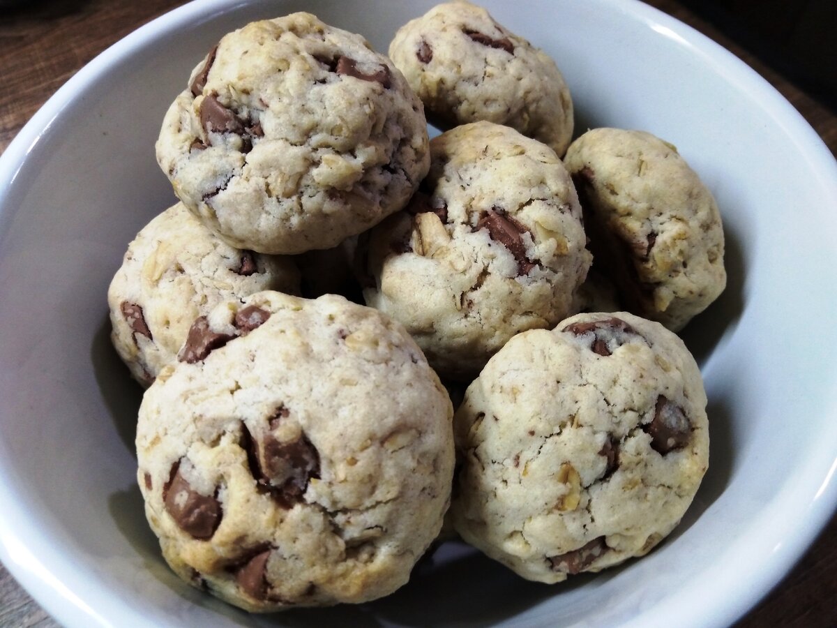 Это печенье трудно назвать абсолютно диетическим уже хотя бы из-за сливочного масла, не говоря уже о шоколаде, сахаре или муке, но один из основных ингредиентов этого десерта - овсяные хлопья, что автоматически переводит такие печенюхи в разряд вполне себе здоровой еды. Особенно, если не набивать себя ими до отказа, а в течение дня хотя бы немного «растрясти» попу или качнуть пресс вечером. Печенье очень «быстрое» - на готовку уходит минут 20-25. Подтаиваем 2/3 пачки сливочного масла, засыпаем 1/3 стакана сахара, растираем, выбиваем яйцу и взбиваем смесь до «гладкости». Кидаем по щепотке соли, корицы ванилина, разрыхлителя теста и еще раз взбиваем смесь. Засыпаем стакан «геркулеса» и тщательно перемешиваем, затем добавляем стакан муки и замешиваем тесто. Закидываем в тесто мелко порубленный шоколад и продолжаем замешивать тесто пока оно не станет эластичным. Включаем духовку на 180°С, а пока печь разогревается, делаем из теста будущие печеньки - шарики «на два укуса». Выкладываем и
