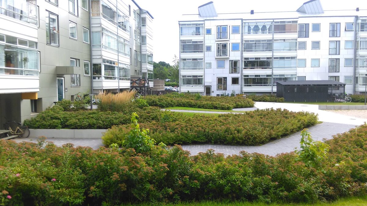 Как сделать дворы у жилых домов классными и недорогими в обслуживании? 1. Двор - не сад. Не стоит подходить к благоустройству двора как к созданию сада, делать композиции из разных растений, одно такое, два таких 2. Двор - общественное пространство. Часть города, не частная территория одной семьи 3. К проектированию двора следует привлекать не дизайнера садов,а архитектора 4. Самый простой подход - все газоны, на которых "не играют в футбол" и не загорают, сплошняком, от края до края, засаживать кустарником. Выбрать пять видов, которые точно растут в нашем климате: рябинник, спирея, лох, еще какие-нибудь два) 5. Кустарники можно брать маленькие, но важен в первые два года, пока не сомкнулись, уход в виде прополки. Между ними все засыпать мульчей 6. Многолетники - не использовать. Это дорого, нужна обрезка, каждого сорта в свое время 7. Если сделать заказ на кустарники в питомнике, на большую партию, дадут очень хорошую цену 8. Сажать просто. Вырыл яму, подсыпал земли (не торфа), посади