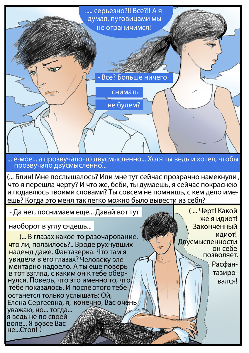 Ты совсем забыл, с кем имеешь дело? Когда это меня так легко было из себя вывести? - Да нет. Поснимаем еще. Наоборот. Давай, вот здесь в углу сядешь… … В глазах какое-то разочарование, что ли появилось?.. Вроде рухнувших надежд даже. Фантазерка. Что я там увидела в его глазах? Человеку элементарно надоело. А ты еще поверь в тот взгляд, с которым он к тебе обернулся. Поверь, что это именно то, что тебе показалось. И после этого тебе останется только услышать: Ой, Елена Сергеевна, я вас, конечно, очень уважаю, но… тогда я ведь вовсе не по своей воле… Я вовсе Вас не… Стоп! … Родионов, сделай личико попроще, мышцы расслабь, не надо демонстрировать всему миру, ей то есть, что ты разочарован… Черт! Стыдно-то как. Идиот законченный. Расфантазировался! Ты с девочкой-соседкой, что ли, с продавщицей из сельпо? Двусмысленности он себе позволяет… Костя так смутился, что начал потихоньку застегивать пуговицы. Тем более, что ЕэС отвернулась, опять рассматривая отснятое в фотоаппарате, брови ее не
