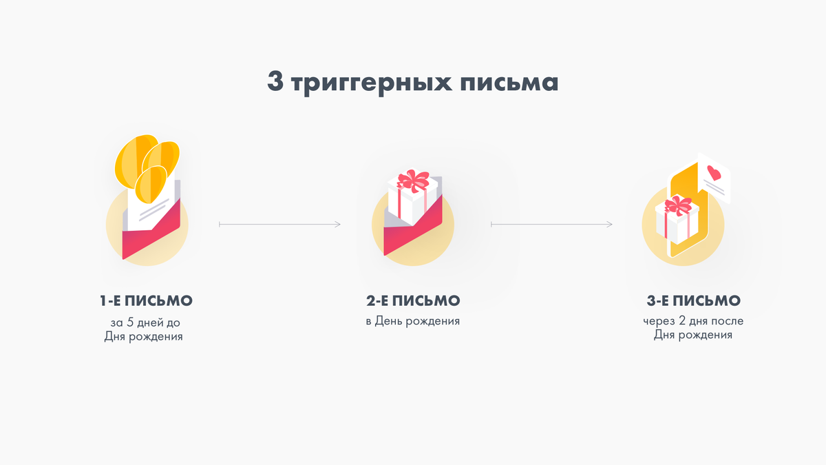 Мы опишем базовую настройку на автоматическую отправку 3-х триггерных писем: за несколько дней до Дня рождения, в сам День рождения и напоминание спустя некоторое время.
