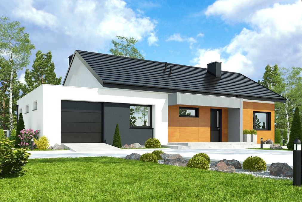 Это современный дом для семьи из 4-5 человек. Дом был спроектирован по кирпичной технологии с использованием сборных стропильных конструкций. Это функциональный проект дома, объединяющий дневную и ночную зоны на одном этаже. Во входной части у нас есть специальный вестибюль со встроенным гардеробом, прачечной и отдельным туалетом. В дневной зоне у нас есть просторная гостиная с местом для удобного обеденного стола. Благодаря большой раздвижной двери мы выходим из гостиной на террасу с беседкой. Характерной особенностью гостиной является большой современный камин, расположенный рядом с кухней. Кухня с U-образной мебелью и дополнительным пространством для кладовой обеспечивает удобное рабочее место. Угловые кухонные окна гарантируют достаточное количество внешнего освещения. Закрытая часть доступна из небольшого коридора, который освещается двумя потолочными окнами, расположенными на потолке. В этой зоне мы спроектировали три спальни, общую удобную ванную комнату с ванной и душем и г