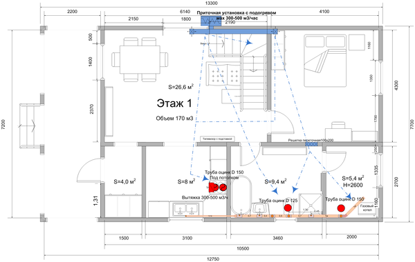 Здравствуйте уважаемые, напомню, в Части 13 моего повествование, мы разработали проект вентиляции (или его подобие), в общем определились, что нам нужно сделать, чтобы обеспечить наш дом чистым свежим воздухом круглый год, не допустить распространения запахов из кухни и туалетов, поддерживать нормальную влажность в ванной комнате и т.д. Пришло время реализовать основные части системы вентиляции. Напомню схему размещения элементов вентиляции. Начнем с монтажа вытяжной вентиляции (на схеме обозначено красным). Для вытяжной вентиляции я нарисовал и заказал, по схеме, следующие элементы из оцинковки: Обошлось примерно в 4 т.р. Начали с монтажа труб внутри дома, чтобы потом было ясно где над ними нужно разместить вент. выходы. через кровлю Аналогично поступаем с фановой канализацией, для перехода 110 трубы на 125 я использовал резиновую "муфту для перехода с пластиковой канализационной трубы на чугунную" Для ванной комнаты первого этажа и туалета второго этажа два канала 120 о