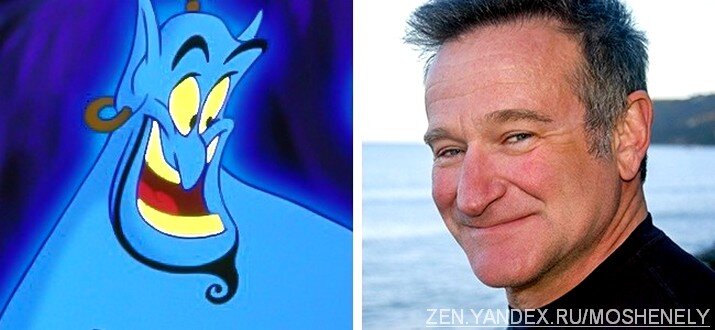Порой создатели срисовывают мультипликационных персонажей с живых людей, так как это либо проще, либо у человека действительно уникальная внешность. Сегодня я отобрал для вас 6 персонажей из мультфильмов, которые очень сильно похожи на реальных людей. 1. «Робин Уильямс – Джин» Если посмотреть на эту фотографию, то можно заметить огромное количество сходств между мультипликационным персонажем и Робином Уильянсом. Создатели этого мультфильма решили, что более подходящего образа Джину не найти. Что же, персонаж действительно получился добрым и веселым, как сам Робин. 2. «Джейкоб Ротшильд - Монтгомери Бёрнс» В мультфильме этот персонаж очень богат и порой корыстен, поэтому неудивительно, что его образ был взят с нескольких влиятельных людей. Образ персонажа был взят с Джейкоба Ротшильда, а характер с Джона Рокфеллера и Фредерика Олсена. 3. «Алисса Милано – Ариэль» Сегодня мультфильмы делать значительно проще, так как программное обеспечение позволяют нарисовать совершенно любого персон
