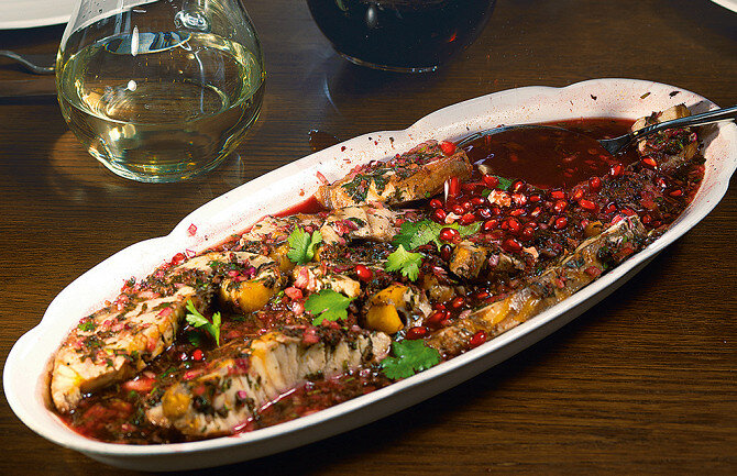 Грузины любят покрывать кухню завесой тайны и ссылаться не на рецепты, а на волшебство, тайное знание бабушки и прочие недосягаемые вещи. Однако художник Георгий Тотибадзе решил нарушить грузинское обыкновение и в деталях рассказал нам, как делаются несколько знаменитых грузинских закусок. Георгий — давний друг нашей редакции. Множество его работ посвящено вкусной и здоровой пище, ибо он любит и есть, и — не меньше — готовить. Он даже стал соавтором двух кулинарных книг: «Гурманиада. Италия. Кулинарный путеводитель» и «Грузия. Первое, второе, третье». Накормив всю редакцию «Еды», Георгий попросил нас никогда не забывать, что у грузинского застолья три правила: столы должны ломиться, бокалы не пустеть, а тосты длиться вечность. Осетрина в гранатовом соусе Гранатовый сок может быть сладким, кисло-сладким и кислым. Для соусов лучше использовать два последних. Сок совершенно не обязательно отжимать самостоятельно — свежевыжатый напиток можно купить на рынке (что удобно — можно сразу и п