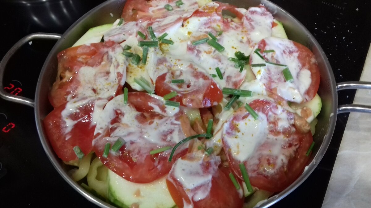 Предлагаю вкусную запеканку. Приготовлю я ее на плите. Конечно, овощи не будут запекаться так как в духовке, а будут тушиться в собственном соку, но тем не менее она ничуть не хуже чем в духовке. Для ее приготовления подойдут любые овощи какие любите, у меня вот такой джентльменский набор, количество на прямую зависит от посуды в которой вы будете ее готовить. Все это моется, чистится и нарезается Да, чуть не забыла, конечно же еще и куриная грудка, ну не совсем она у нас овощная. Мясо нарезать тонкими кусочками Все овощи нарежем кружками Приготовим соус, можно просто все смазывать сметаной или майонезом, я беру сметану и томатную пасту Приступаем Наливаем на сковороду подсолнечное масло, чуть чуть нагреем сковороду, чтобы масло равномерно распределилось по сковороде и начинаем выкладывать слои, пока мы их выкладываем огонь лучше выключить. Первый слой кабачки, смазываем их соусом Выкладываем мясо и тоже смазываем его соусом Третий слой лук, его мы смазывать не будем Следующим слоем