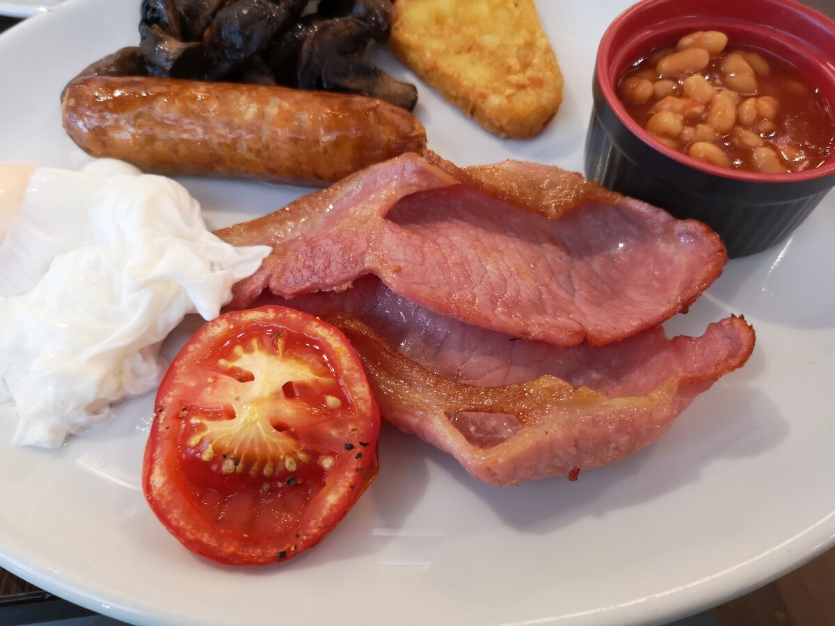 Классический британский завтрак. Фасоль, бекон, помидоры, хашбраун, сосиска, яйцо, грибы. Съешь такой - и на полдня забываешь о еде))) Перед тем, как приготовить завтрак, у вас спросят, полный завтрак сделать, или без какого-то компонента. Вы можете попросить не делать для вас сосиску или, например, бекон. Но в первый день традиция – съесть весь завтрак)) Тем более, что с таким завтраком можно смело дожить до ужина, ничего больше не перекусывая))