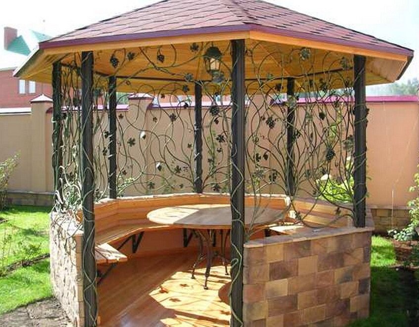 Лучшее место для организации места отдыха, которое будет не только комфортным, но и скрасит дачный дворик – это восьмигранная беседка. Постройка такого вида может быть закрытой и открытой, для изготовления конструкции можно использовать почти любой материал. Стоит отметить, что единственной сложность при постройке является восьмиугольная геометрия, однако при правильном подходе и изготовлении подробных чертежей, даже эта форма не доставит проблем. Какие материалы можно использовать В наше время, ассортимент сырья на рынке значительно вырос, особого труда выбрать материал не составит. Для подбора оптимального по цене сырья, нужно досконально изучить характеристики и ценовую категорию. Рассмотрим основные: Также, популярным является кирпич. Главные свойства – это прочность, теплосбережение, долговечность. Разнообразные виды кирпича, будут привлекательно смотреться на приусадебном участке, даже без дополнительной отделки. Идеи дизайна Основной деталью дизайна, которая придает внешний вид,