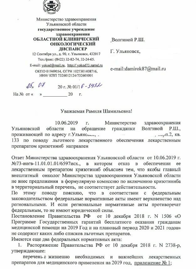 Ульяновский юрист Дмитрий Старчиков уличил региональное министерство здравоохранение в публичном обмане и нарушении прав пациентов «Вместо того, чтобы выдать дорогостоящее лекарство, минздрав Ульяновской области предложил онкобольной девушкеежедневно ездить в дневной стационар. На протяжении последних месяцев Рамиле Волгинойотказывали в выдаче нужного ей лекарства, а теперь предлагают ездить за каждой таблеткой в стационар. Это вместо того, чтобы выдать упаковку препарата в аптеке. Территориальная программа ОМС Ульяновской области содержит в себе отсылки к базовой программе, которая, в свою очередь, предусматривает полное и бесплатное лекарственное обеспечение любыми препаратами, относящимися к жизненно необходимым и важнейшим лекарствам. Ульяновский минздрав продолжает лгать, но уже не только в личной переписке, а и со страниц своего сайта. Препарат «Кризотиниб» входит в перечень жизненно необходимых, а лекарства из этого перечня отпускаются по рецептам бесплатно при лечении в амбу