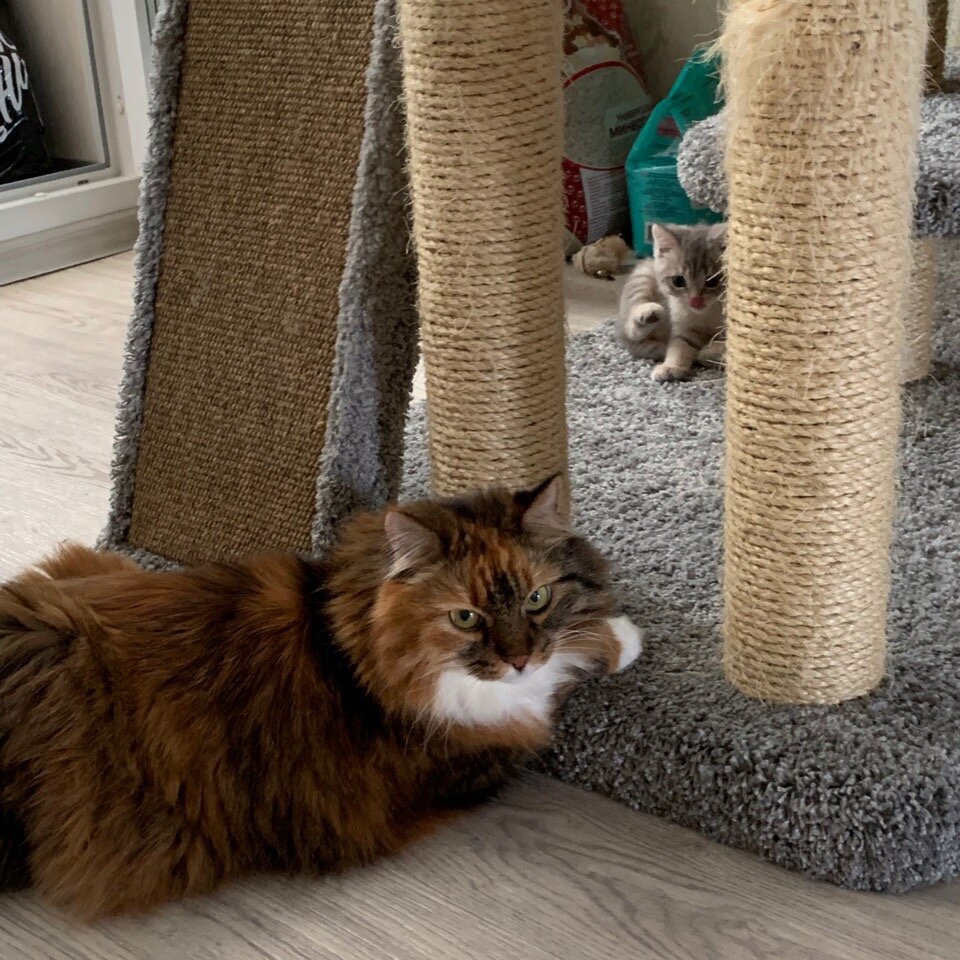 Не могу не показать эту серию фото Нори и Фионы. Малышка Фиона сильно подросла, похорошела, благодаря ей мои кошки стали чаще играть с игрушками, стали более подвижные. Эта девочка мертвого достанет ))) Целый день напролет готова играть, а мои кошки составляют ей компанию, каждый по очереди. Нори тоже не исключение. Движуха каждый день, любой колпачок, любая крышечка идет в ход. Раньше лежало это все пылилось в углу, сейчас до драки, кому первому достанется ))) Нори единственный, кто не обижает Фиону, он вообще парень нейтральный, ко всем новеньким относится спокойно, порой кажется, что он их даже не замечает. Как можно не влюбиться в это чудо, как можно было оставить такую прелесть на остановке??? Фиона уже залезает на обеденный стол и ходит по нему как-будто так и надо. Спать стала со мной возле подушки, всю ночь, до звонка будильника она лежит рядом со мной. Глаза у Фионы огромные и круглые как блюдца, британская кровь проявляется все больше. За ней пока новые хозяева не пришли, но