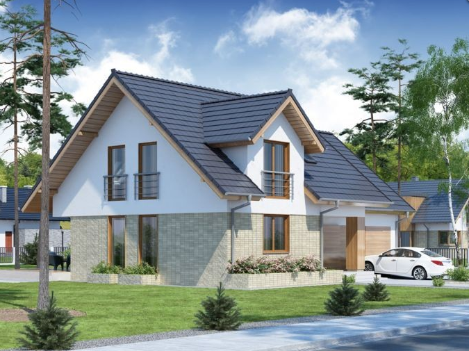 Элегантность и функциональность являются наиболее важными характеристиками, которые определяют данный проект. Это кирпичное здание классической формы, в котором спланирован первый этаж и чердак, и все это было покрыто несложной крышей. Два больших слуховых окна появляются из ската крыши, оптимально увеличивая и освещая чердачные помещения. Мансардное помещение со стороны сада имеет балкон. Для тех, кто любит отдых на природе, несомненно, подойдет просторная терраса, примыкающая к дому по всей ширине заднего фасада. Входная зона в дом запланирована в аркаде. Далее есть прихожая, из которой можно попасть в большой двухместный гараж. За его стеной два помещения были разделены; одна для котельной, а другая для сада, которая идеально подходит для хранения садового инвентаря или другого оборудования. Вспомогательная программа на первом этаже была дополнена дополнительной комнатой - идеальное место для учебы. Рядом с ней запланирована ванная комната с душевой кабиной. Зал соединяется с уютн
